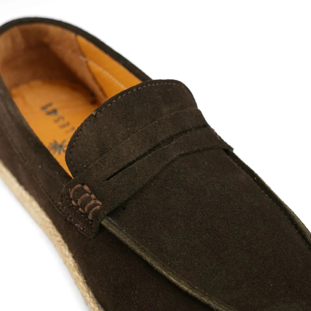 Leather Espadrille Loafers—a perfect fusion of sophistication and casual comfort. Crafted from premium textured leather, this slip-on features a classic penny loafer silhouette with a hand-stitched vamp detail. The woven jute midsole gives it an authentic espadrille touch, offering a breathable, lightweight feel. Finished with a durable rubber outsole for extra grip, this versatile pair is ideal for warm-weather styling, vacations, and everyday wear.