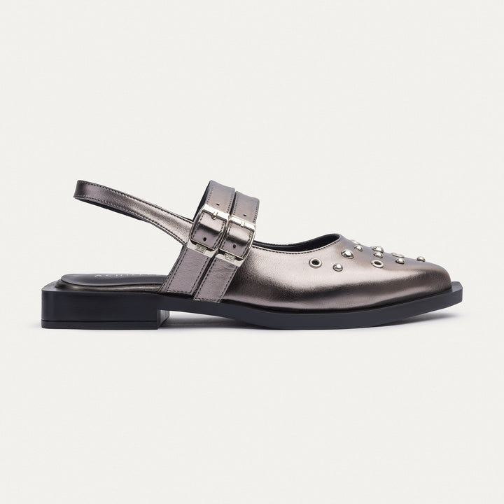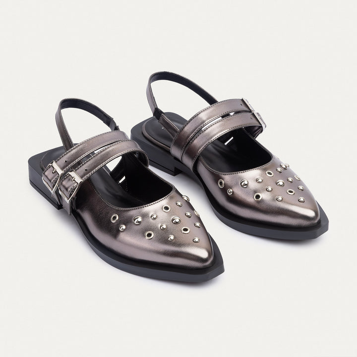 The Gilded Stud Slingback redefines flat footwear with a bold twist. Crafted in high-gloss patent leather and detailed with gold grommet studs, this Achilles pair fuses punk edge with architectural femininity. A pointed toe and double buckle straps create a sleek, standout silhouette made for statement days.