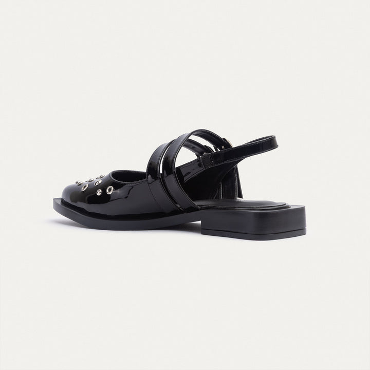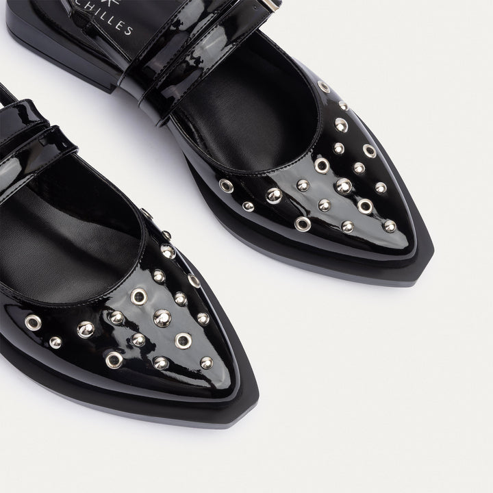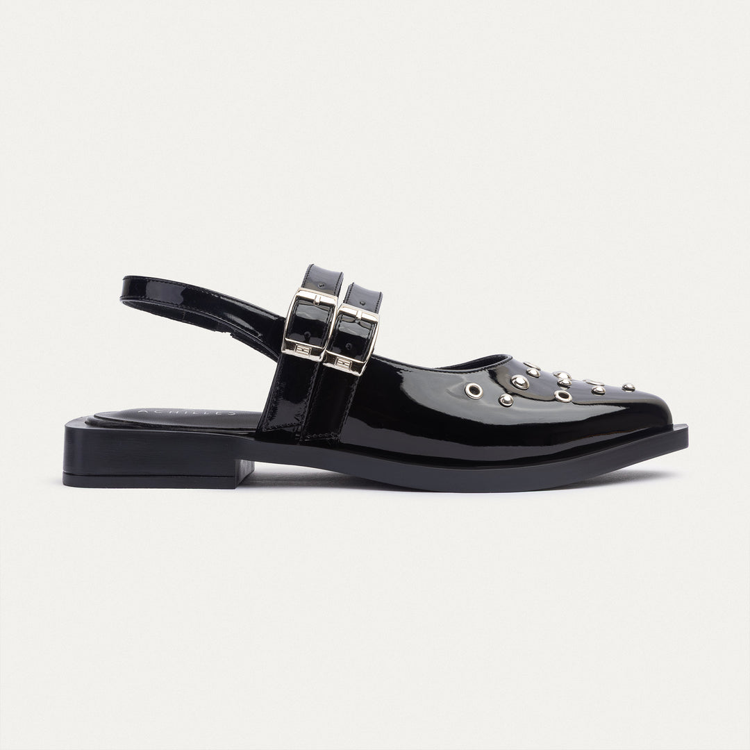 The Gilded Stud Slingback redefines flat footwear with a bold twist. Crafted in high-gloss patent leather and detailed with gold grommet studs, this Achilles pair fuses punk edge with architectural femininity. A pointed toe and double buckle straps create a sleek, standout silhouette made for statement days.