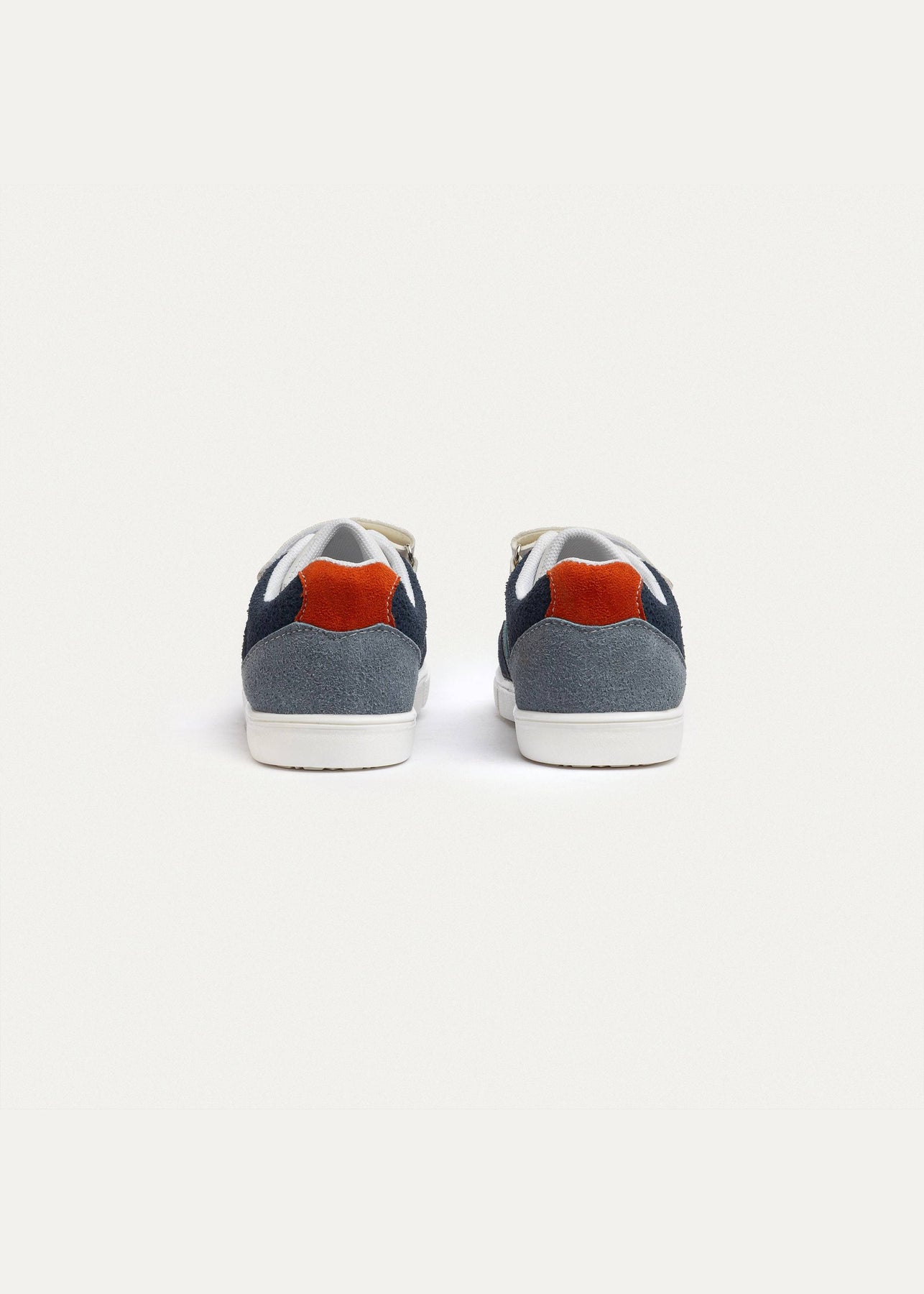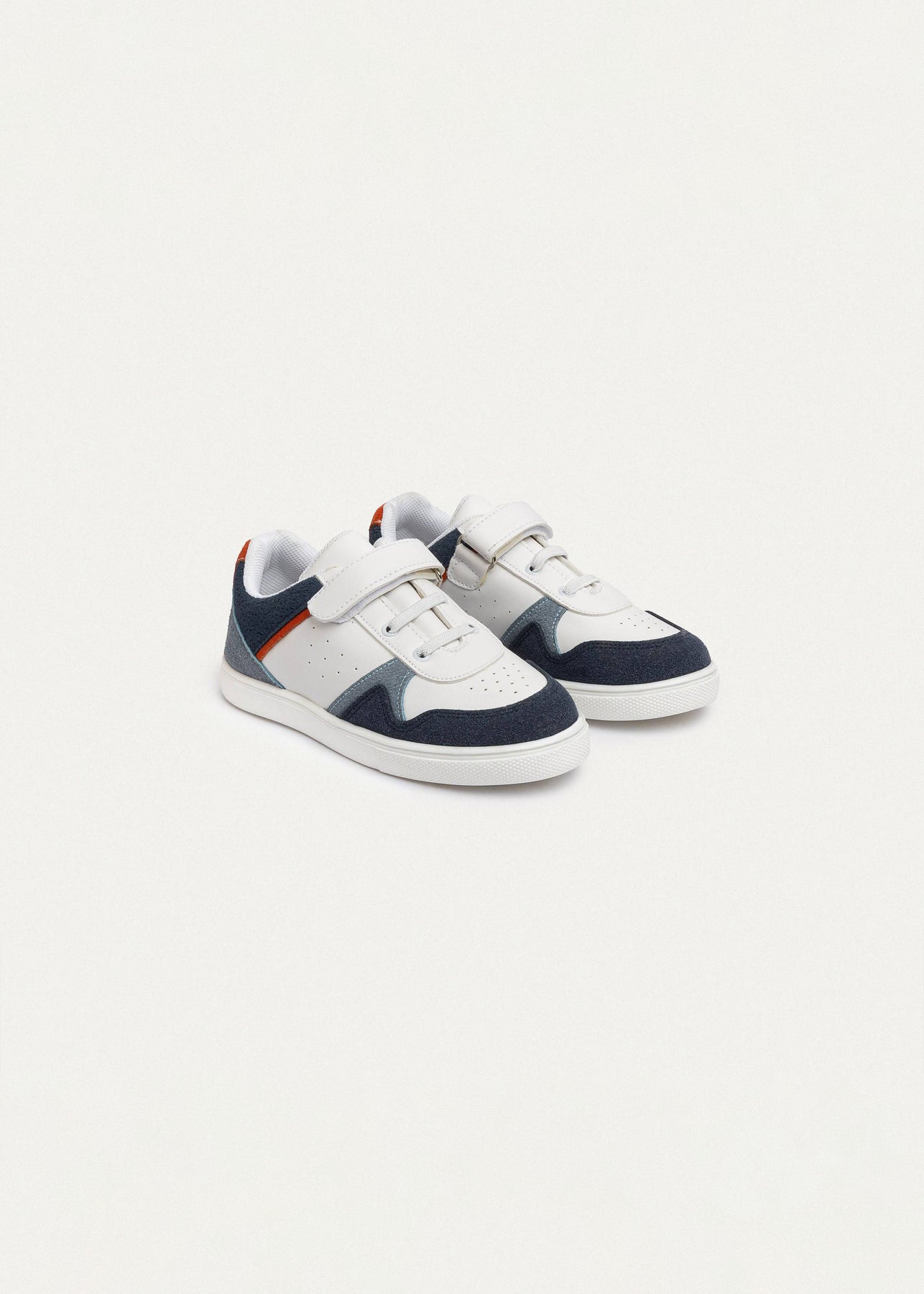 White/navy upper with light grey panels and an orange pop