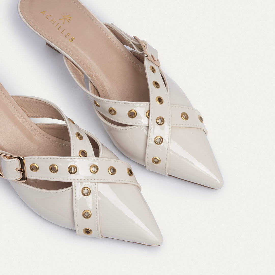 Introducing the Achilles Clara Buckled Patent Mules, a statement footwear piece that blends sophistication with an edge. Designed for the modern woman who loves to command attention, these mules feature a pointed-toe silhouette, glossy patent leather, and bold metallic eyelets for a rebellious yet elegant look. The crossover strap detail with an adjustable buckle ensures a secure fit while adding a touch of high-fashion allure.