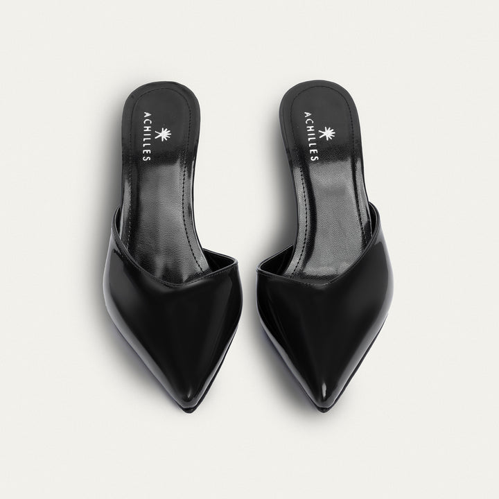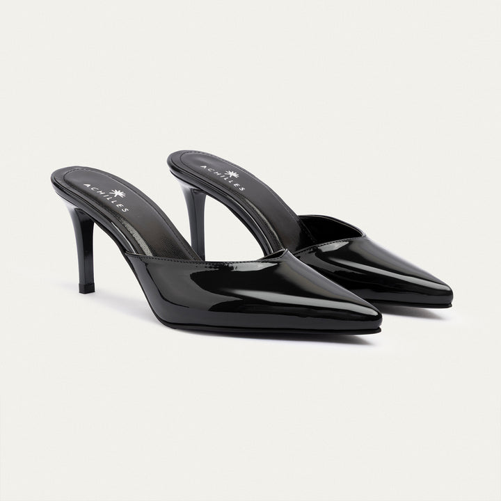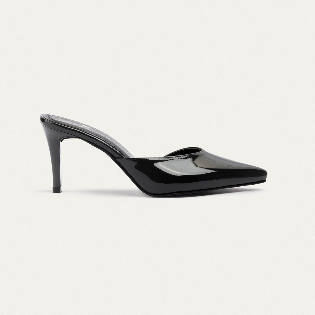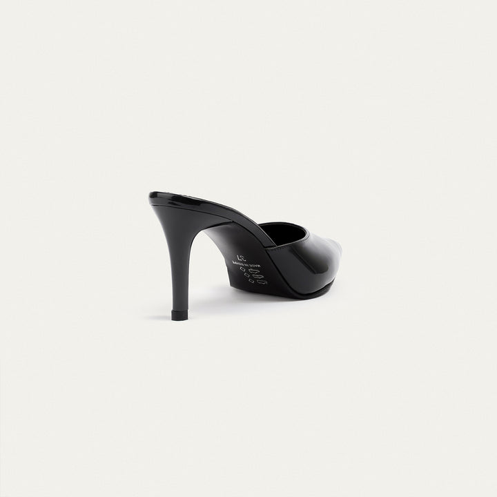 The Cleo mulesآ is a sleek, modern mule that redefines minimalism with its sharp silhouette and glossy black patent finish. Featuring a pointed toe and 7 cm stiletto heel, this backless heel creates a sophisticated statement without sacrificing comfort. Designed for the bold and confident woman, this piece is a versatile staple for evening events or elevated daywear.