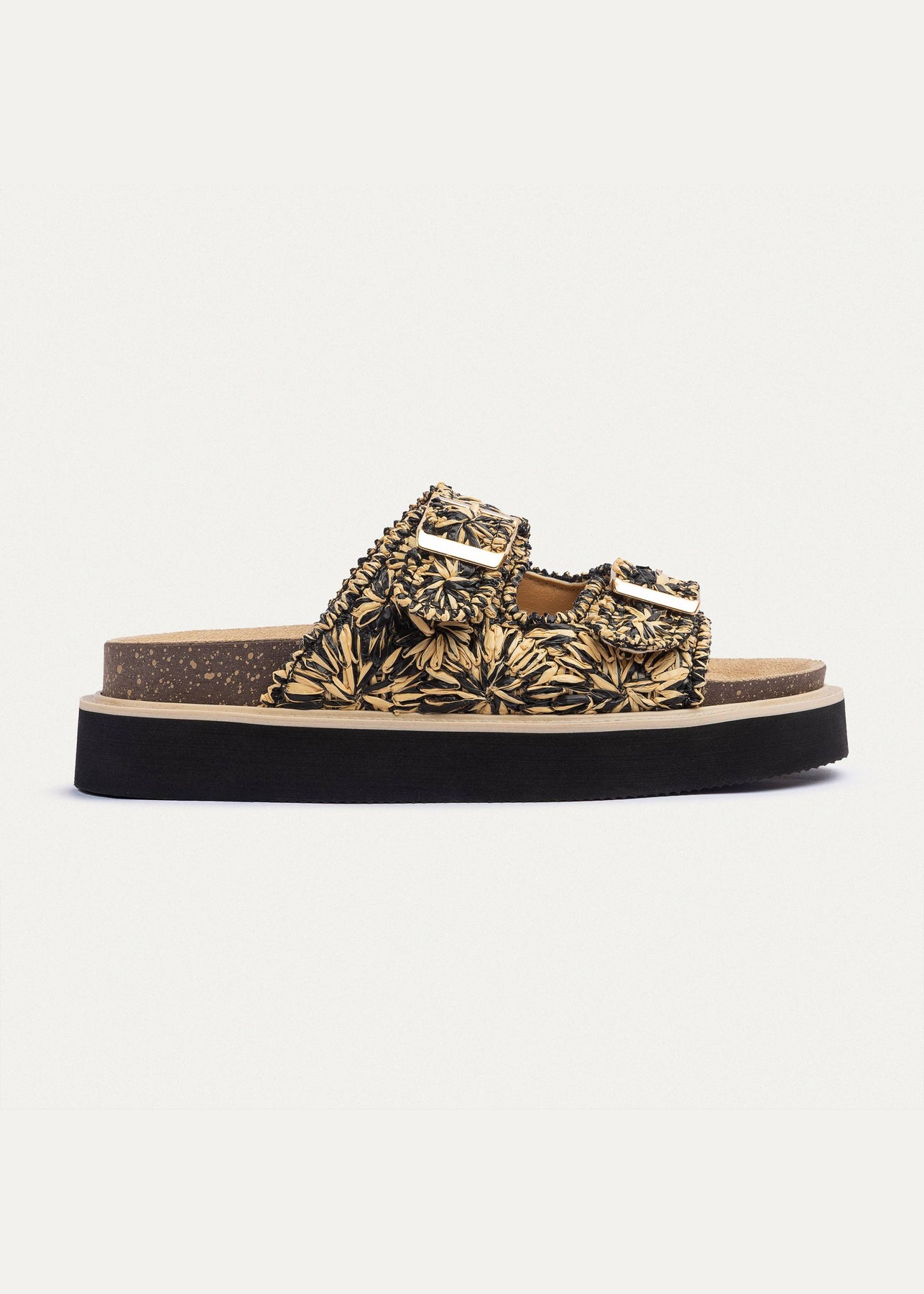 Rooted in sunshine and self expression, theآ Soleil Buckle Platform by Achilles Studios the spirit of creative summer days. Featuring embroidered textures, gold-finished buckles, and a grounded platform sole, this statement slide brings wearable art into everyday life.