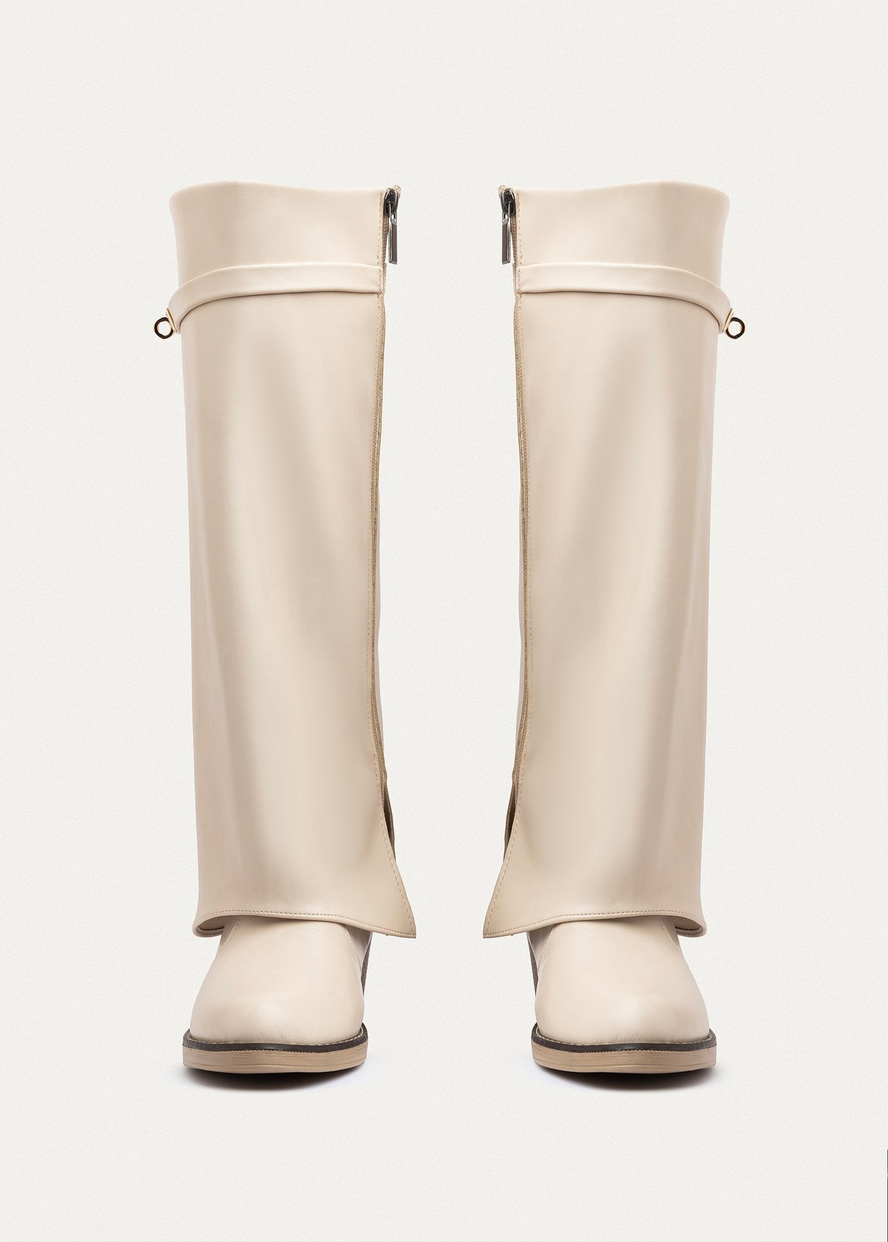 These fold-over boots are the perfect way to add a touch of style and comfort to your fall and winter wardrobe. The boots are made from a high-quality faux leather that is both durable and stylish. The fold-over cuff adds a touch of personality and allows you to customize the look of the boots to your liking. The gold-toned buckle detail adds a touch of sophistication and makes these boots perfect for dressing up or down.